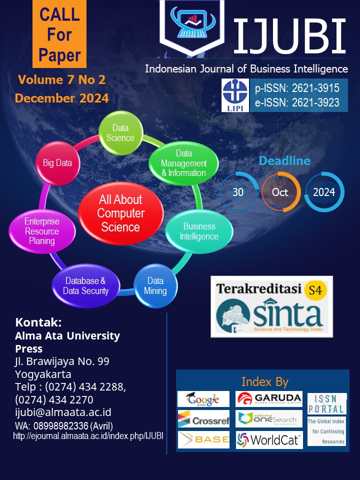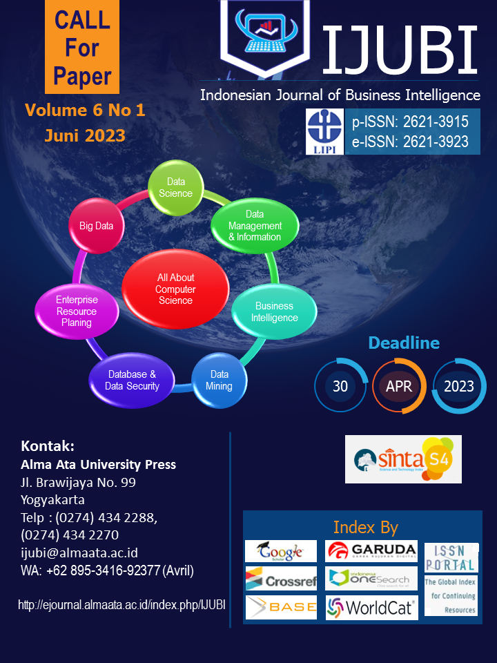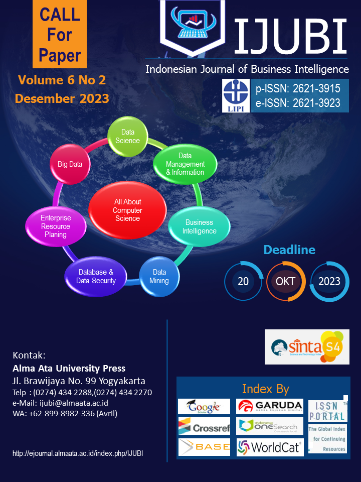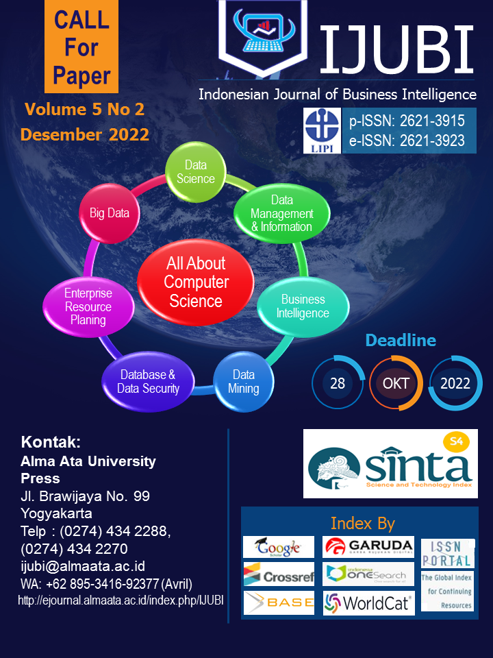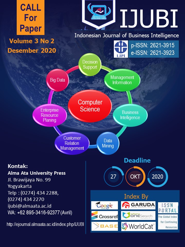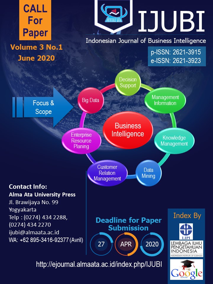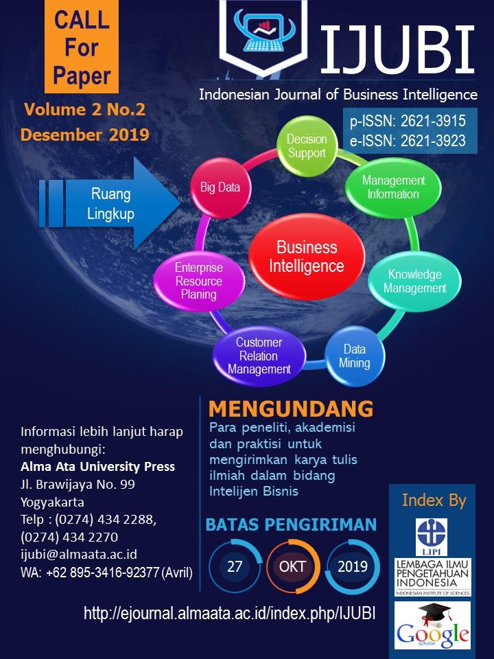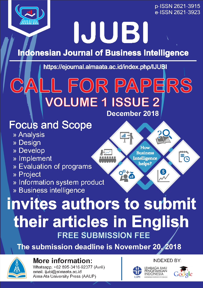 Assalamualaikum Wr Wb. Kepada seluruh penulis Indonesian Journal of Business Intelligence (IJUBI). Kami informasikan bahwa Indonesian Journal of Business Intelligence (IJUBI) belum menerapkan kebijakan fast track (penerbitan jurnal yang dipercepat). Biaya penerbitan jurnal sesuai dengan yang tertera di website ini. Apabila ada biaya lain di luar biaya tersebut, maka bukan menjadi tanggung jawab kami. Terima Kasih Wassalamualaikum WrWb. |