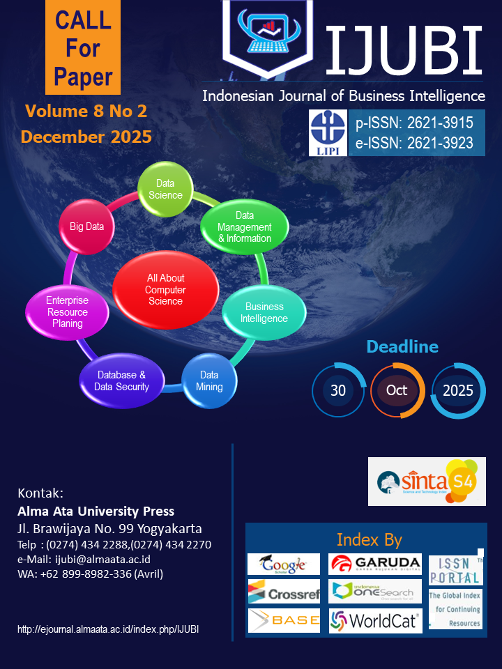 Indonesian Journal of Business Intelligence (IJUBI) is a scientific journal which publishes results of research, literal study, system design and development in business intelligence. The focus of the journal is innovative works on analysis, design, develop, implement, evaluation of programs, project, and information system product in strategic management and business intelligence. The journal is published as periodically. A year is published twice on June and December.