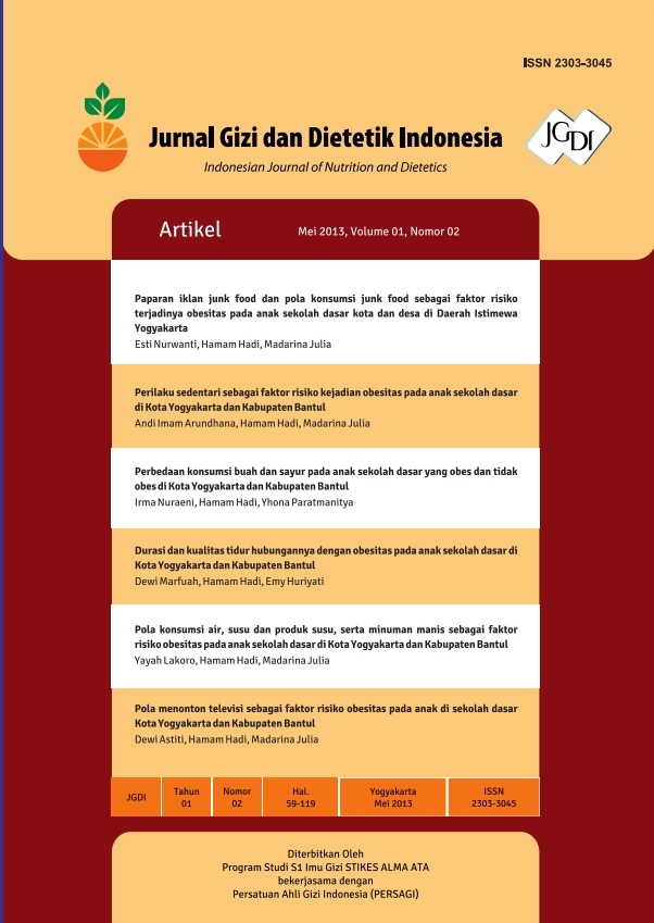 Latar Belakang: Indonesia saat ini mengalami masalah gizi ganda, yaitu masalah gizi kurang dan gizi lebih. Kelebihan gizi atau obesitas pada anak dan remaja apabila tidak diatasi maka berdampak menjadi obesitas pada masa dewasa yang berpotensi mengalami penyakit tidak menular, seperti jantung, hipertensi dan diabetes mellitus. Prevalensi obesitas pada anak di Provinsi Daerah Istimewa Yogyakarta mengalami peningkatan dari tahun ke tahun (1; 2). Obesitas disebabkan ketidakseimbangan antara masukan dengan keluaran energi. Anak cenderung mengkonsumsi padat energi yang berasa manis dan berlemak tinggi serta makanan kurang serat dari buah dan sayur. Beberapa penelitian menunjukkan peningkatan risiko obesitas pada orang yang kurang konsumsi buah dan sayur.