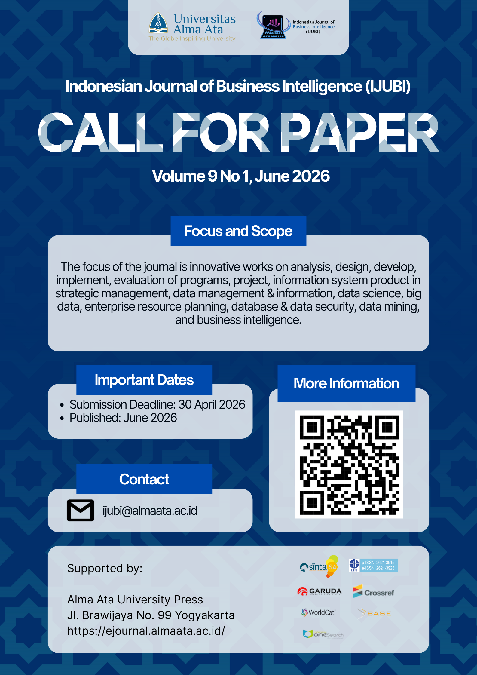 CALL FOR PAPERS VOLUME 3 ISSUE 2 Jun 23, 2020 We invite researchers, academics and practitioners to submit scientific papers, research results, literal studies, system designs and developments in business intelligence. The focus of this journal is to innovate working on the analysis, design, development, implementation, evaluation of programs, projects, and information systems products in strategic management and business intelligence. If you have a paper titled beyond the scope of the above topic, we are still open to considering it as long as it is related to Computer Science.