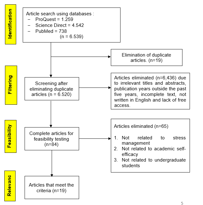 Methods : This literature review used PICO framework to develop articles questions (P : undergraduate students, I : stress management, C: not applicable, and O: academic self-efficacy). Articles search for literature review was conducted during November and December 2024. This study used ProQuest, ScienceDirect and Pubmed databases. The keywords that used in this scoping review for the ProQuest were "stress management" AND "self-efficacy" AND "college student". For the ScienceDirect, the keywords were "non-pharmacological intervention" AND "self-efficacy" AND "college students". For the PubMed, the keywords used were "intervention" AND "self-efficacy" AND "college student".
