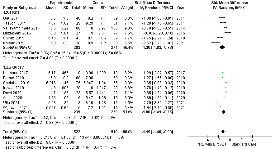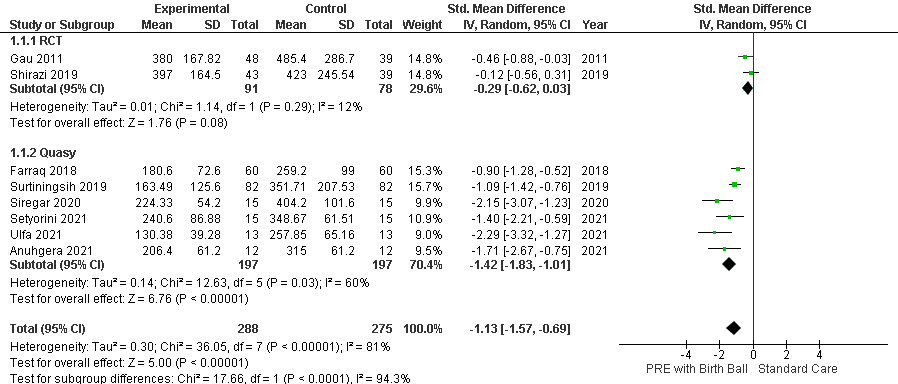 Results: PRE using birth ball obtained statistically proven results to shorten the length and reduce labor pain than the control group. The experimental group had a significant effect in reducing labor duration and pain after intervention -1.13 [95% CI: -1.57, -0.09] p<0.00001 and -1.19 [95% CI: -1.48, -0.90] p <0.00001.