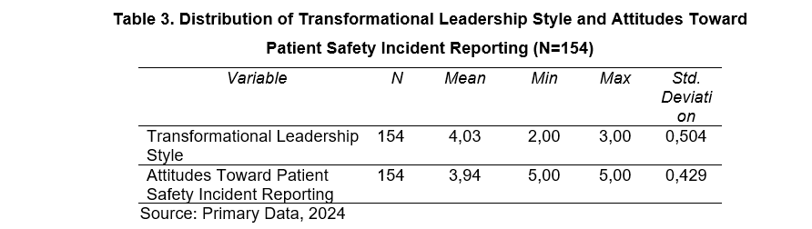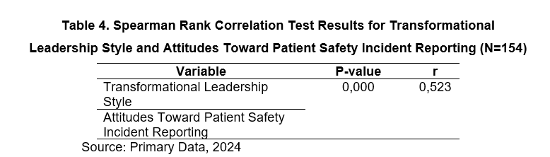 Results : The findings revealed that transformational leadership had a mean score of 4.03 (SD = 0.504), while attitudes toward patient safety incident reporting had a mean score of 3.94 (SD = 0.429). Spearman Rank correlation analysis showed a significant positive relationship between transformational leadership and attitudes toward patient safety incident reporting (p = 0.000, r = 0.523). This indicates that the higher the implementation of transformational leadership by the head nurse, the more positive the nurses' attitudes toward reporting patient safety incidents.